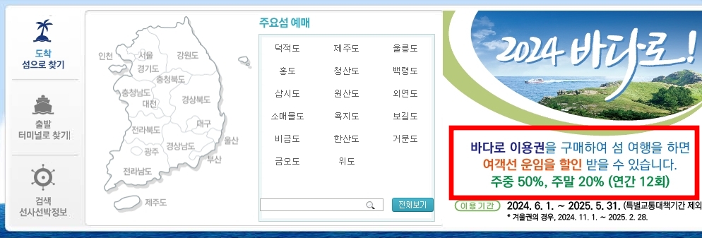 바다로 이용권을 이용하면 주중 요금의 최대 50%까지 할인을 받을 수 있으며 온라인으로 간단하게 티켓을 구매할 수 있습니다. '가보고 싶은 섬' 홈페이지에서 티켓을 구매하고, 해당 티켓을 통해 여객선 예매 시 할인을 적용받으면 됩니다. 아래 배너에 접속하면 바로 이용권을 구매할 수 있습니다.