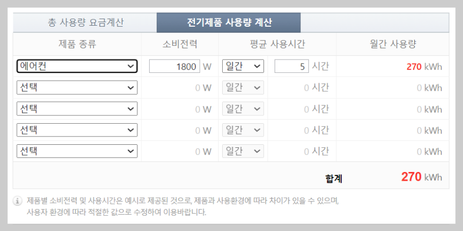 📌Tip : 구매 예정인 전기제품의 소비전력과 평균 사용시간을 입력하여 나온 합계를 총 사용량 요금계산에 전월, 또는 평균 전기요금 사용량에 합산해서 계산하면 대략적인 전기요금을 확인 할 수 있습니다.