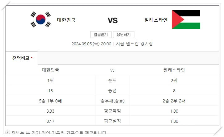 9월 5일 대한민국 vs 팔레스타인 경기일정