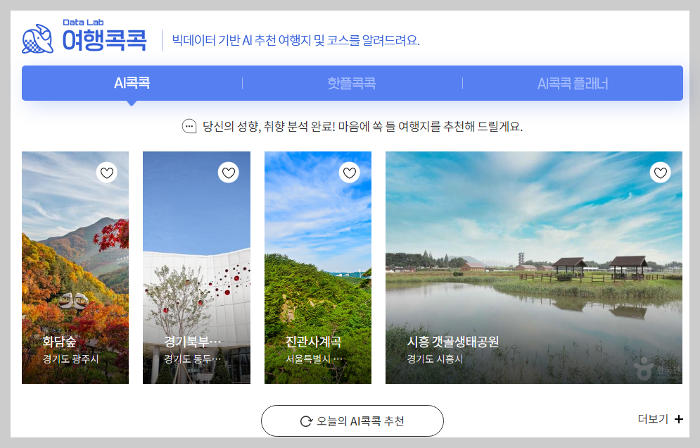 대한민국 구석구석 빅데이터 기반 AI추천 여행지 및 코스도 확인해 볼 수 있어서 여행지를 선택하는데 도움을 받을 수 있습니다. 디지털 관광주민증도 발급받고 아래 이미지에 접속해서 성향과 취향 분석해 주고 마음에 드는 여행지도 추천받아 보세요.
