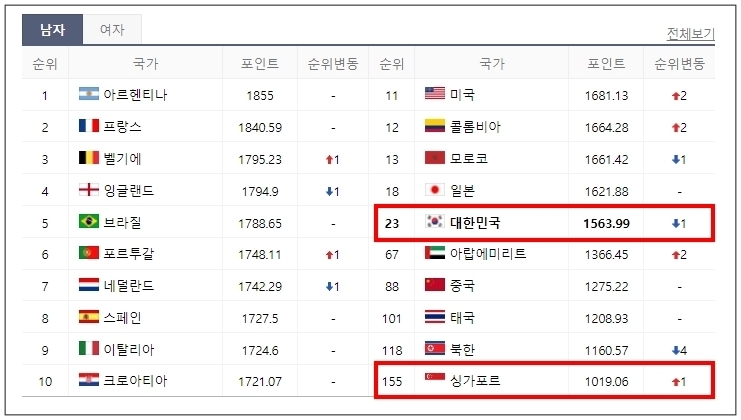 한국의 피파랭킹 23위, 싱가포르 155위입니다. 역대전적 27전 22승 3 무 2패입니다. 대한민국과 싱가포르의 축구 역대 전적을 살펴보면, 대한민국이 대부분의 경기에서 우세를 점해 왔습니다.