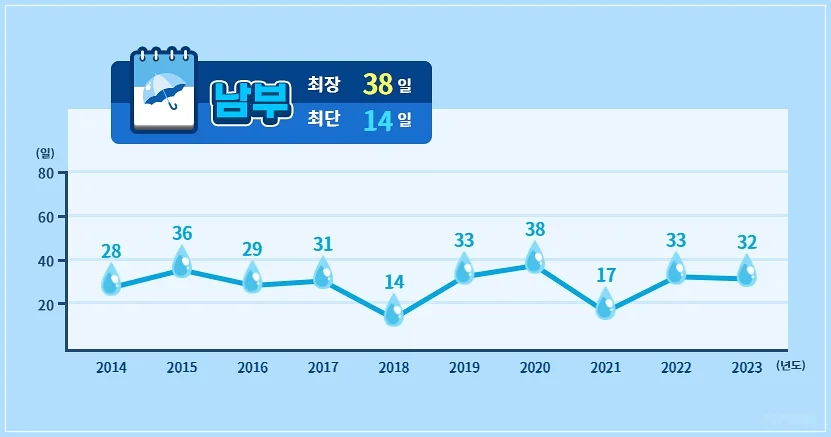 남부지방의 장마 지속 기간은 2020년도에 최장 38일을 기록했으며 2023년 장마기간은 32일입니다. 남부지방은 장마기간은 중부와 비슷하지만 강수량은 다소 적은 편입니다