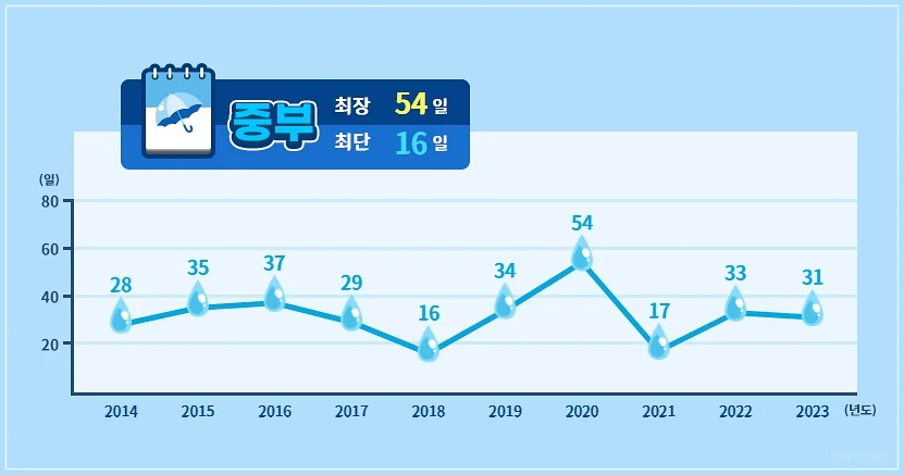 중부지방의 장마 지속기간은 2020년도에 최장 54일간 지속되었으며 2023년 장마기간은 31일입니다. 전국 평균 지역보다 더 많은 비가 내리며 10년간 평균 장마 시작일은 6월 26일에 시작해 7월 26일에 끝나며, 총 31일 동안 지속되었습니다.